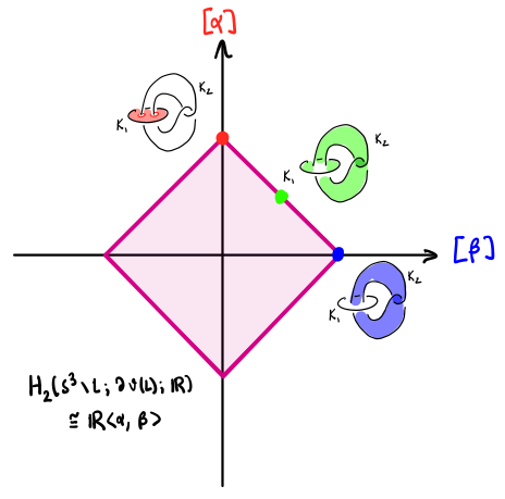 As an example, we try to compute the Thurston norm for the complement $S^3 \setminus \nu(L)$ of the Whitehead link $L \subset S^3$. The real homology of the complement is a real vector space of rank $2$, generated by Poincare dual to the meridians of each of the components $K_1, K_2$ indicated in the picture. These are given by the thrice-punctured sphere $\alpha$ bounded by $K_1$, and the punctured torus $\beta$ bounded by $K_2$, respectively, indicated by the red and blue surfaces in the picture. Each of these have Euler characteristic $-1$ and are norm-minimizing, so they are in the unit sphere for the Thurston norm. Symmetrically, $-\alpha, -\beta$ are also elements in the unit sphere. In the picture we also have a green dot which corresponds to the class of $(\alpha + \beta)/2$. Note that $\alpha + \beta$ is represented by the surface drawn in green, given by an oriented sum of the surfaces $\alpha$ and $\beta$. This is a “Seifert surface” for the Whitehead link, and its Euler characteristic is \(-2\) (sum of the ones for \(\alpha, \beta\)). In fact, we shall show next time that the entire line segment connecting \((1, 0)\) and \((0, 1)\) is contained in the unit sphere. Therefore, the unit norm-ball is the magenta diamond above.
